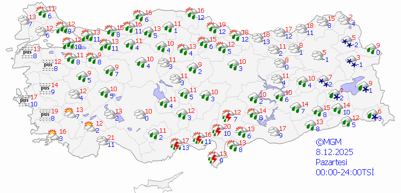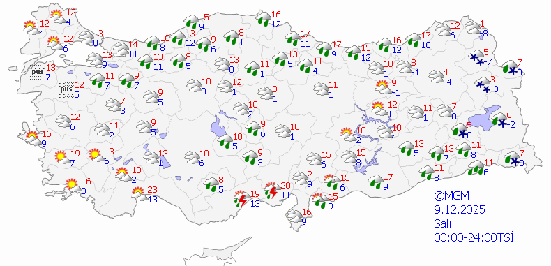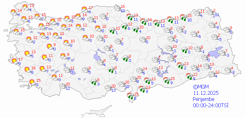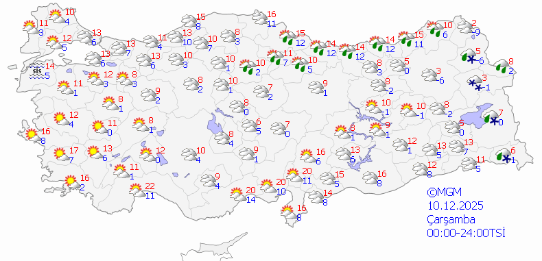 Meteoroloji Genel Müdürlüğü tarafından yapılan tahminlere göre: Ülkemiz genelinin çok bulutlu, Güney Ege ile Çanakkale, İzmir, Zonguldak, Bolu ve Karabük çevreleri dışında kalan bütün bölgelerimizin aralıklı yağışlı geçeceği tahmin ediliyor.
