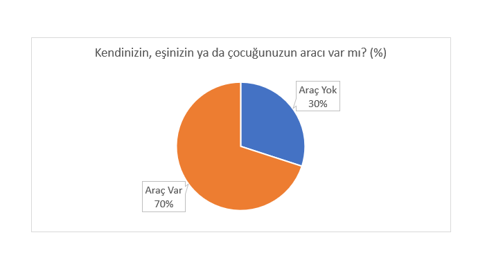 Araç Sahipliği: Katılımcıların %70'i araç sahibi olduğunu belirtirken, %30'unun aracı bulunmuyor.