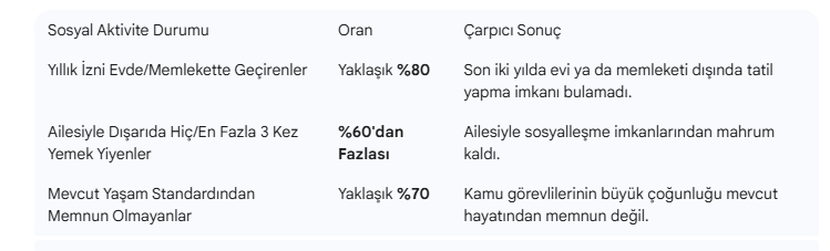 Geçim Sıkıntısı Alarmı: Kamu görevlilerinin %92'si maaşı dışında ek gelire ihtiyaç duyduğunu, %80'e yakını ise mevcut gelirinin yetersiz olduğunu ifade etti. Bu ekonomik baskı nedeniyle, memurların %11'i geçinebilmek için mesai saatleri dışında ikinci bir işte çalışmak zorunda kalıyor.