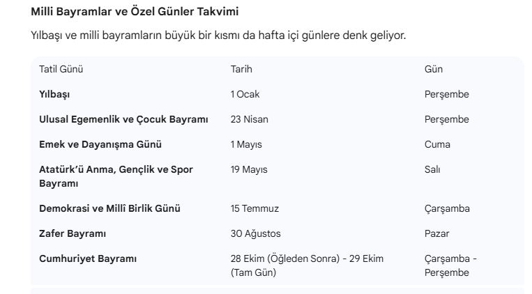 2026 yılında 30 Ağustos Zafer Bayramı'nın Pazar gününe denk gelmesi, hafta sonu tatili dışında ek bir izin sağlamayacak. Ancak 1 Mayıs Cuma günü ve 29 Ekim Perşembe günü tatilleri, hafta sonu ile birleştirme potansiyeli sunuyor.