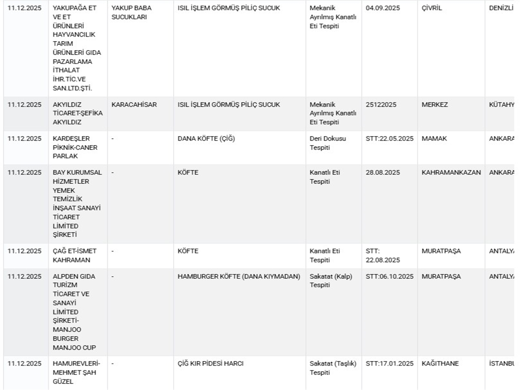Tarım ve Orman Bakanlığı, gıda ürünlerinde taklit ve tağşiş yaparak sağlığı tehlikeye düşüren firmaları içeren listeyi güncelledi. Tüketicinin güvenilir gıdaya erişimini sağlamak amacıyla açıklanan listeye, 2'si sağlığı tehlikeye düşürecek ürün olmak üzere toplam 36 yeni ürün daha eklendi. Yapılan denetim ve analizlerde; yarım yağlı yoğurtlarda nişasta, zeytinyağlarında tohum yağı karışımı tespit edildi. En dikkat çekici tespitlerden biri ise Ankara'da faaliyet gösteren bir firmanın çiğ dana köfte harcında deri dokusu belirlenmesi oldu.