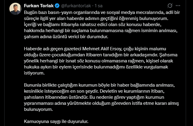 Furkan Torlak'ın konuya ilişkin X paylaşımı şöyle: