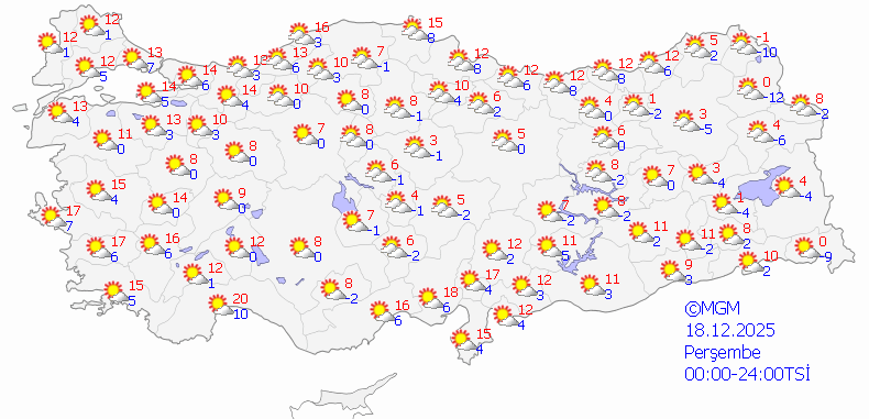 Meteoroloji Genel Müdürlüğü'nün tahminlerine göre, Türkiye genelinde hava parçalı ve yer yer çok bulutlu olacak. Yağışların; Marmara'nın doğusu, Batı ve Orta Karadeniz, Doğu Karadeniz kıyıları ile Muğla'nın güney, Antalya ve Sivas'ın batı kesimlerinde etkili olması bekleniyor. Yağışlar genellikle yağmur ve sağanak şeklinde görülürken, Karadeniz'in iç kesimleri ile Ardahan çevrelerinde karla karışık yağmur ve kar bekleniyor.
