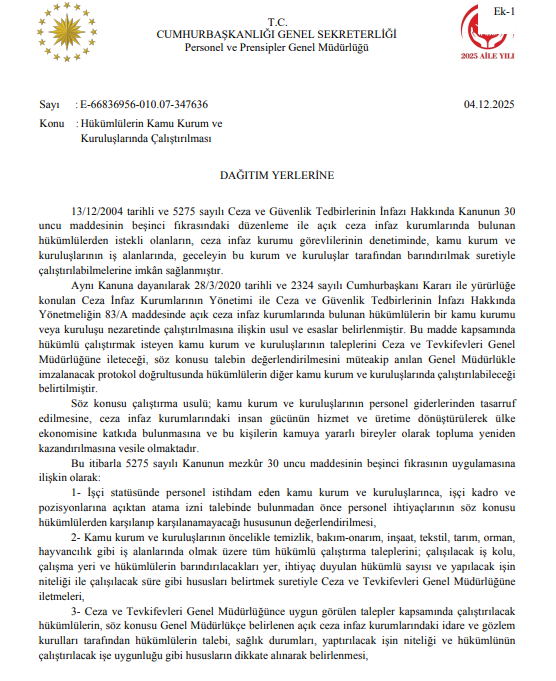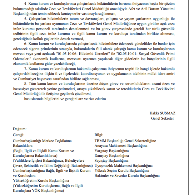 Kamuda Hükümlü Çalıştırılması Hakkında CB'den Yazı!