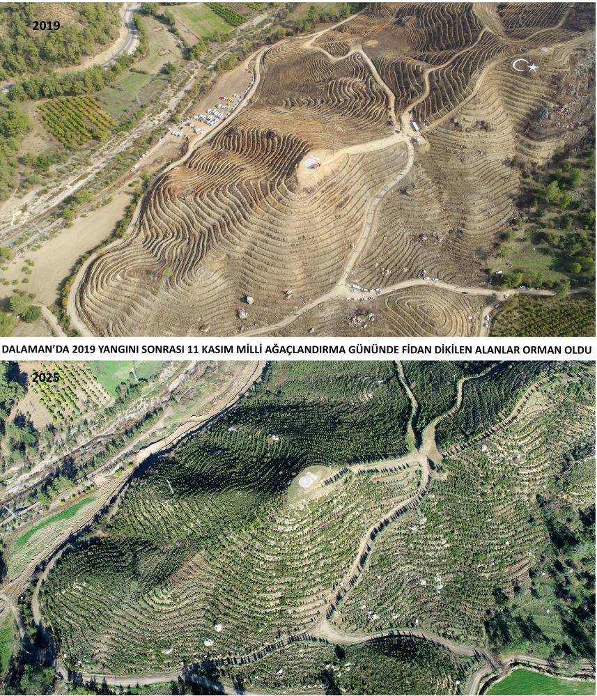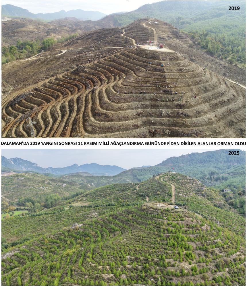 Dalaman-Göcek yangınında yanan bin 433 hektar alanın tekrar ağaçlandırılması çalışmaları kapsamında yaklaşık 450 bin fidan dikildi ve alana yaklaşık 35 ton tohum atıldı. Dalaman'da 11 Kasım 2019'da dikilen fidanlar aradan geçen 6 yılda büyüdü ve yer yer 3 metreye bulan boylarıyla genç ağaçlara dönüştü.