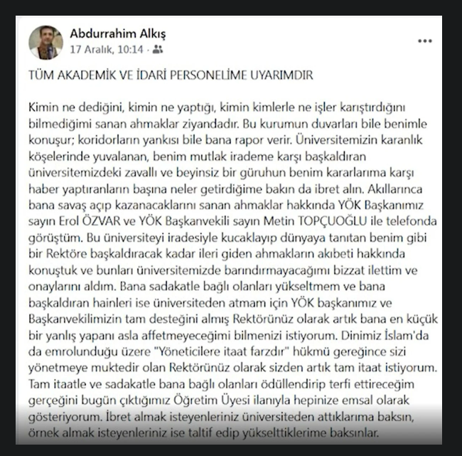 ODA TV'de yer alan haberde, Alkış'a atfedilen ve üniversite içindeki personele yönelik "tam itaat" çağrısı içeren ifadeler kamuoyunda geniş yankı uyandırmış, üniversite ise bu paylaşımların kendileriyle ilgisi olmadığını savunmuştu.