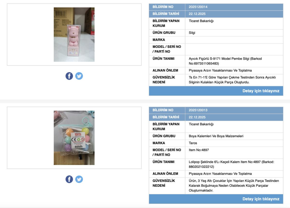 Bakanlığın yayınladığı listeye göre, çocukların kullandığı ayıcık figürlü silgi ve Taros marka lolipop şeklindeki 6'lı keçeli kalem boğulma riski taşıyor.
