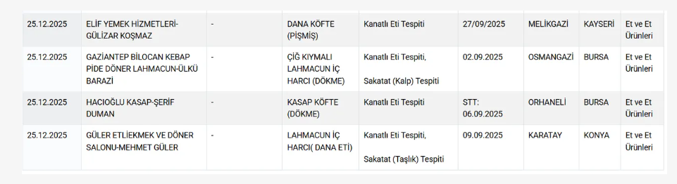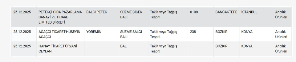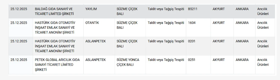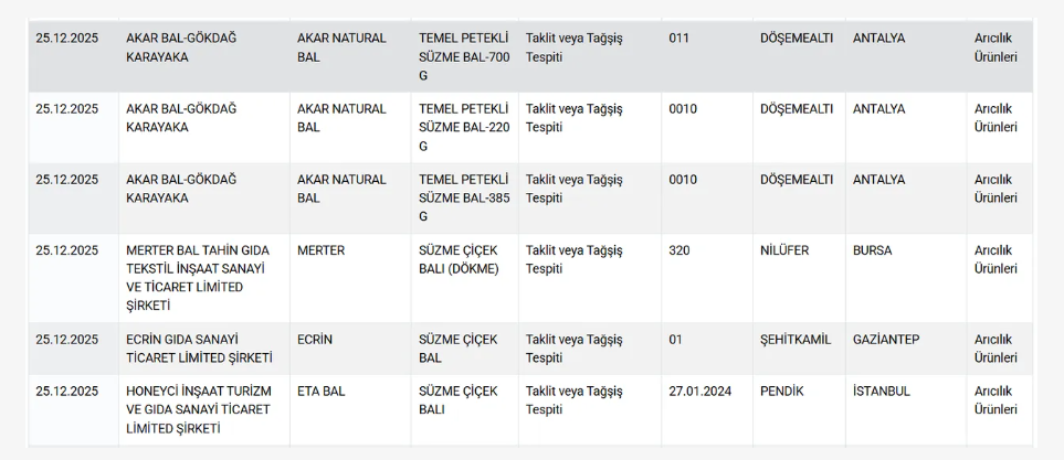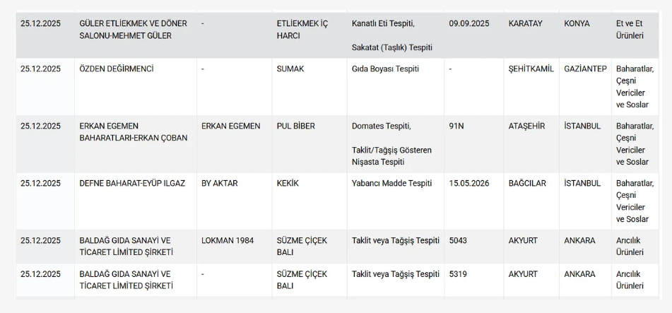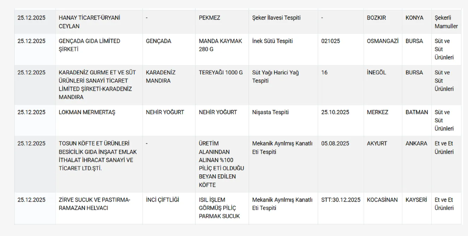 Tarım ve Orman Bakanlığı, 25 Aralık 2025 tarihli güncel "Taklit veya Tağşiş Yapılan Gıdalar" listesini yayımladı. 81 ilde eş zamanlı yürütülen denetimlerde; lahmacun ve etliekmek harcına "taşlık" ve "kanatlı eti" karıştırıldığı, manda yoğurdunun aslında inek sütünden yapıldığı ve balların neredeyse tamamının taklit olduğu belirlendi. Bakanlık, vatandaşları "guvenilirgida" portalı üzerinden markaları kontrol etmeye çağırdı.