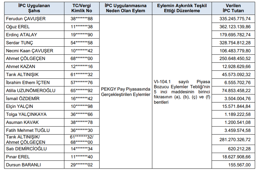 Yapılan değerlendirme sonucunda SPK bülteni yayımlandı, mevzuata aykırı işlemler nedeniyle 19 kişiye toplam yaklaşık 2 milyar 30 milyon TL tutarında idari para cezası uygulanmasına karar verildi.
