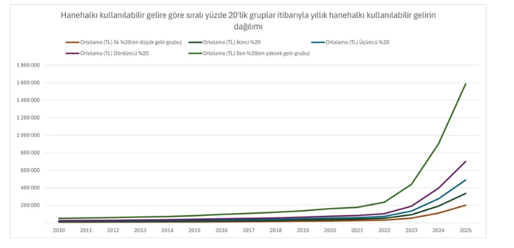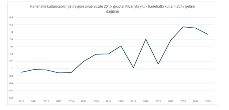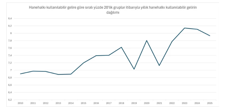En yüksek gelir yüzde 20'lik grubunun yıllık ortalama gelirinin en alt yüzde 20'lik gelir grubunun ortalama gelirine oranı 2010'da 6,97 olurken, 2025'te 7,93 oldu.