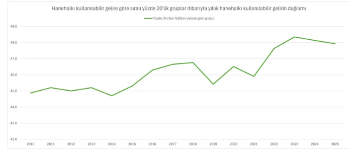 En üst gelir grubunda toplam gelirden alınan pay, 2010 yılında yüzde 44,9 olurken, 2023'te bu pay yüzde 48,3'e yükseldi. 2025'teyse yüzde 47,9 oldu.