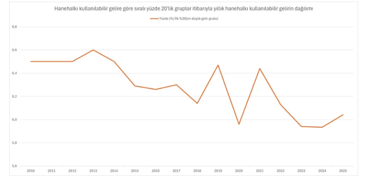En alt gelir grubunun toplam gelirden aldığı pay, 2010'da yüzde 6,5 olurken, 2013'te 6,6'ya çıkmıştı. En düşük oran 2024'te 5,9 ile görüldü. 2025'te ise en alt gelir grubu toplam gelirin yüzde 6'sını alabildi.