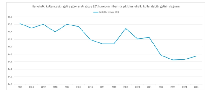 Üçüncü yüzde 20'lik gelir grubuna bakıldığında ise orta sınıftaki erime göze çarptı. 2010 yılında toplam gelirden yüzde 15,6 pay alan bu grup 2025'te son iki yıldır bir miktar yükseliş göstermesine karşın yüzde 14,8 paya ulaştı.