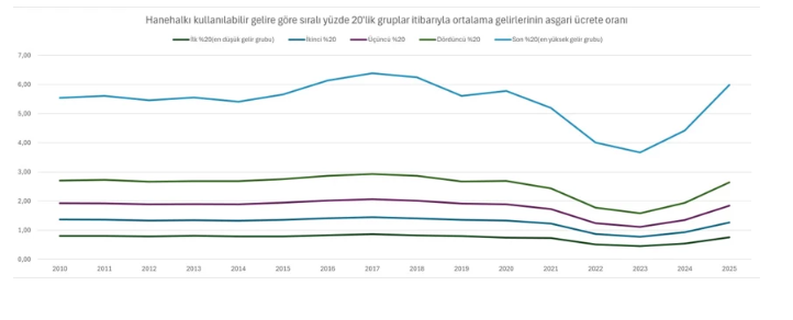 En alt gelir grubu asgari ücrete en yakın gelir düzeyine 0,86 asgari ücret ile 2017'de erişebilirken, 2010'dan bu yana ikinci yüzde 20'lik grup 2022-2024 yılları aralığında asgari ücretin altına ilk kez düşüyor; 2025'te 1,27 asgari ücretle toparlıyor.