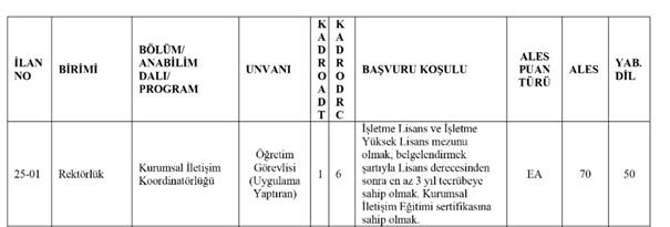 Aşağıdaki görselde şartlarını gördüğünüz ilanda da benzer şekilde bir süreç yaşanmaktadır. Ağrı İbrahim Çeçen Üniversitesi tarafından 29 Aralık 2025 tarihli Resmi Gazete'de ilan edilen Kurumsal İletişim Koordinatörlüğü Öğretim Görevlisi kadrosunda; "İşletme Lisans ve İşletme Yüksek Lisans mezunu olmak, belgelendirmek şartıyla lisans derecesinden sonra en az 3 yıl tecrübeye sahip olmak. Kurumsal İletişim Eğitimi sertifikasına sahip olmak." şartı aranmıştır.