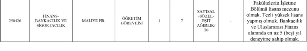 Erzincan Binali Yıldırım Üniversitesi tarafından 30 Aralık 2025 tarihli Resmi Gazete'de ilan edilen Üzümlü Meslek Yüksekokulu Finans-Bankacılık ve Sigortacılık Bölümü Maliye Programında; "Fakültelerin İşletme Bölümü lisans mezunu olmak. Tezli Yüksek Lisans yapmış olmak. Bankacılık ve Uluslararası Finans alanında en az 5 (beş) yıl deneyime sahip olmak." şartı aranmıştır.