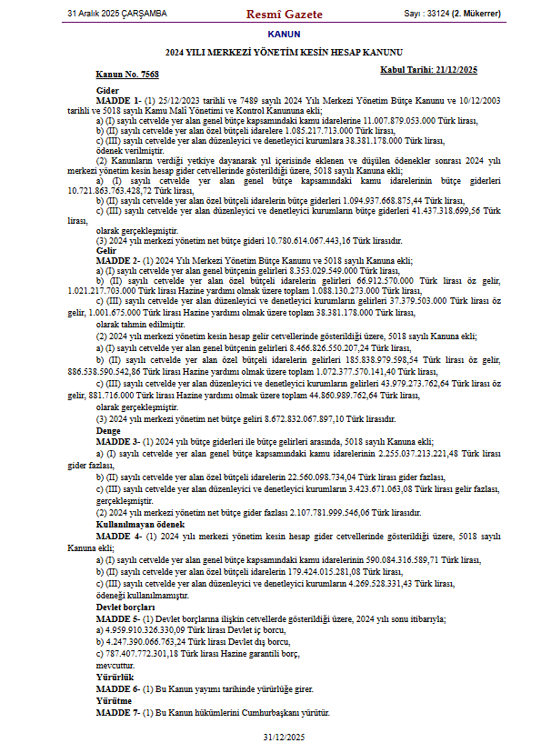 21/12/2025 tarihinde kabul edilen (Kanun No: 7568) 2024 Yılı Merkezi Yönetim Kesin Hesap Kanunu 31 Aralık 2025 tarihli 2. mükerrer Resmi Gazete'de yayımlandı.