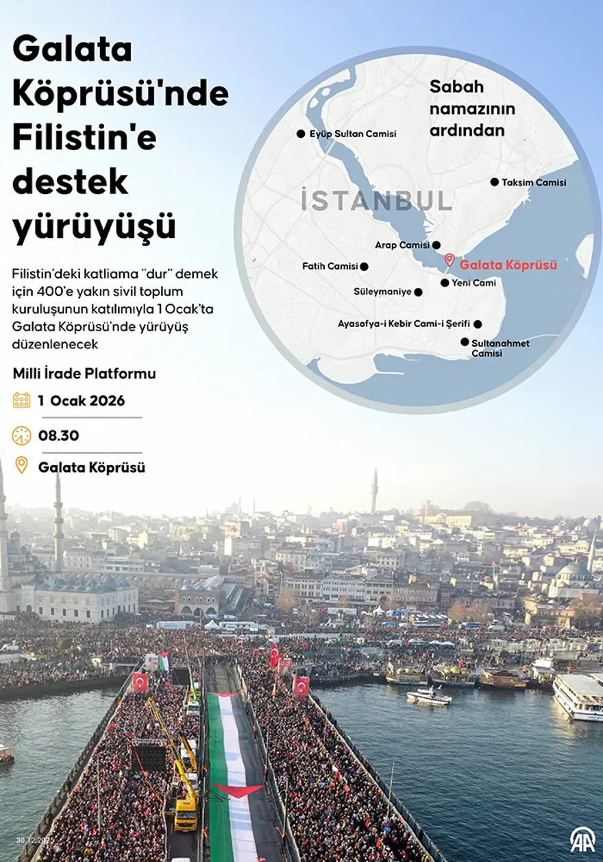 Yeni yılın ilk gününde on binlerce kişi, bir kez daha Milli İrade Platformu ve İnsanlık İttifakı öncülüğünde Galata Köprüsü'nde buluşuyor. Sabah namazının ardından, İstanbul'un dört bir yanından gelen katılımcılar Galata Köprüsü'ne yürüyecek. Yürüyüş, Ayasofya, Sultanahmet, Taksim, Yeni Cami, Süleymaniye ve Fatih camilerinde kılınacak sabah namazının ardından başlayacak. Birçok sendika, 400'e yakın sivil toplum kuruluşu ile spor kulüplerinin de destek verdiği yürüyüşe, geçen yıl olduğu gibi Türkiye'nin dört bir yanından katılım bekleniyor.