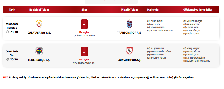 5 Ocak Pazartesi günü oynanacak Galatasaray-Trabzonspor maçını Cihan Aydın, 6 Ocak Salı günü oynanacak Fenerbahçe-Samsunspor karşılaşmasını ise Ali Şansalan yönetecek.