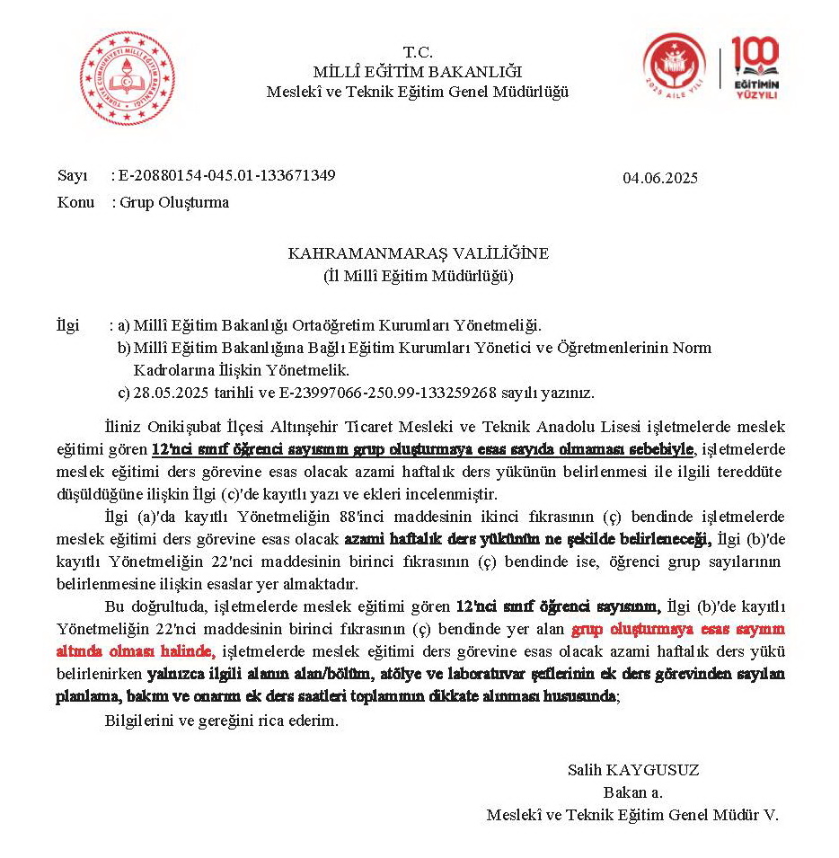 Milli Eğitim Bakanlığı Mesleki ve Teknik Eğitim Genel Müdürlüğünün Kahramanmaraş Valiliğine vermiş olduğu bu görüş yazısında, "Yönetmeliğin 22'nci maddesinin birinci fıkrasının (ç) bendinde yer alan grup oluşturmaya esas sayının altında olması halinde, işletmelerde meslek eğitimi ders görevine esas olacak azami haftalık ders yükü belirlenirken yalnızca ilgili alanın alan/bölüm, atölye ve laboratuvar şeflerinin ek ders görevinden sayılan planlama, bakım ve onarım ek ders saatleri toplamının dikkate alınması hususunda;" şeklinde açıklamalarda bulunmuştur.