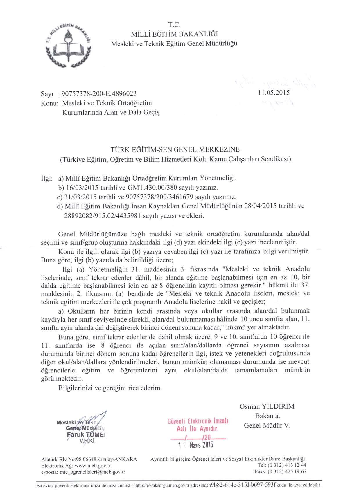 Türk Eğitim Sen tarafından Bakanlığa sorulan sorulara; Milli Eğitim Bakanlığı Mesleki ve Teknik Eğitim Genel Müdürlüğü 31/03/2015 tarih ve 3461679 sayılı yazılarıyla "öğrenci eksilse bile aynı dal veya alanda eğitim devam edileceği" şeklinde cevap vermiştir.