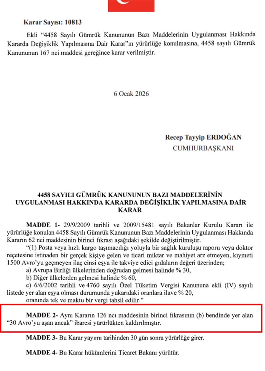 6 Ocak 2026 tarihli Resmi Gazete'de yayımlanan Cumhurbaşkanı Kararı ile, 4458 sayılı Gümrük Kanunu'na dayalı olarak uygulanan 30 Euro'luk gümrük muafiyeti yürürlükten kaldırıldı. Buna göre, yurt dışından verilen tüm bireysel siparişler artık gümrük vergisine tabi olacak