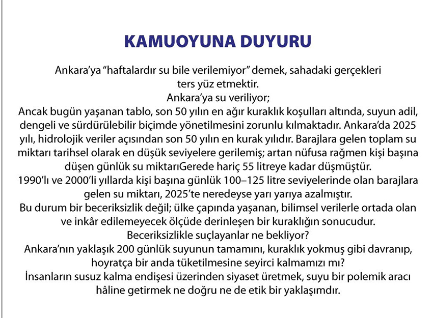 Bu nedenle su yönetiminin dengeli yürütülmesinin zorunlu hale geldiğini belirten Yavaş, kuraklığın kesintilerin arka planındaki ana unsur olduğunu vurguladı. Söz konusu açıklamalar, belediyenin resmi sosyal medya hesapları üzerinden de paylaşıldı.