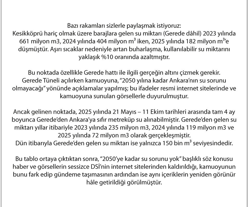 Örneğin, T24'ün resmi internet sitesinde yer alan ve Yavaş'ın "Bu durum kuraklıktan değil teknik arızadan kaynaklanmaktadır" dediği video haberin artık erişime kapalı olduğu görülüyor. Bu durum, kamuoyunda "önceki açıklamalar mı sildiriliyor?" sorusunu da beraberinde getirdi.