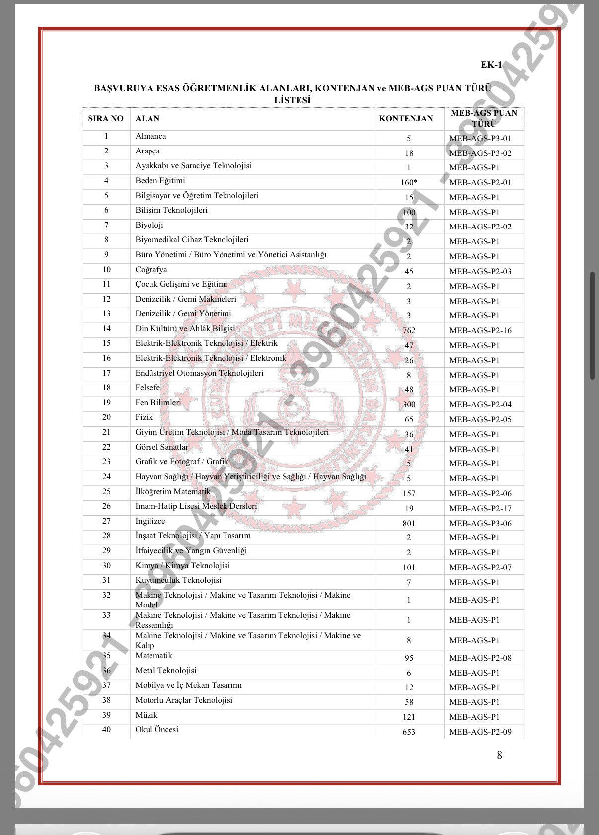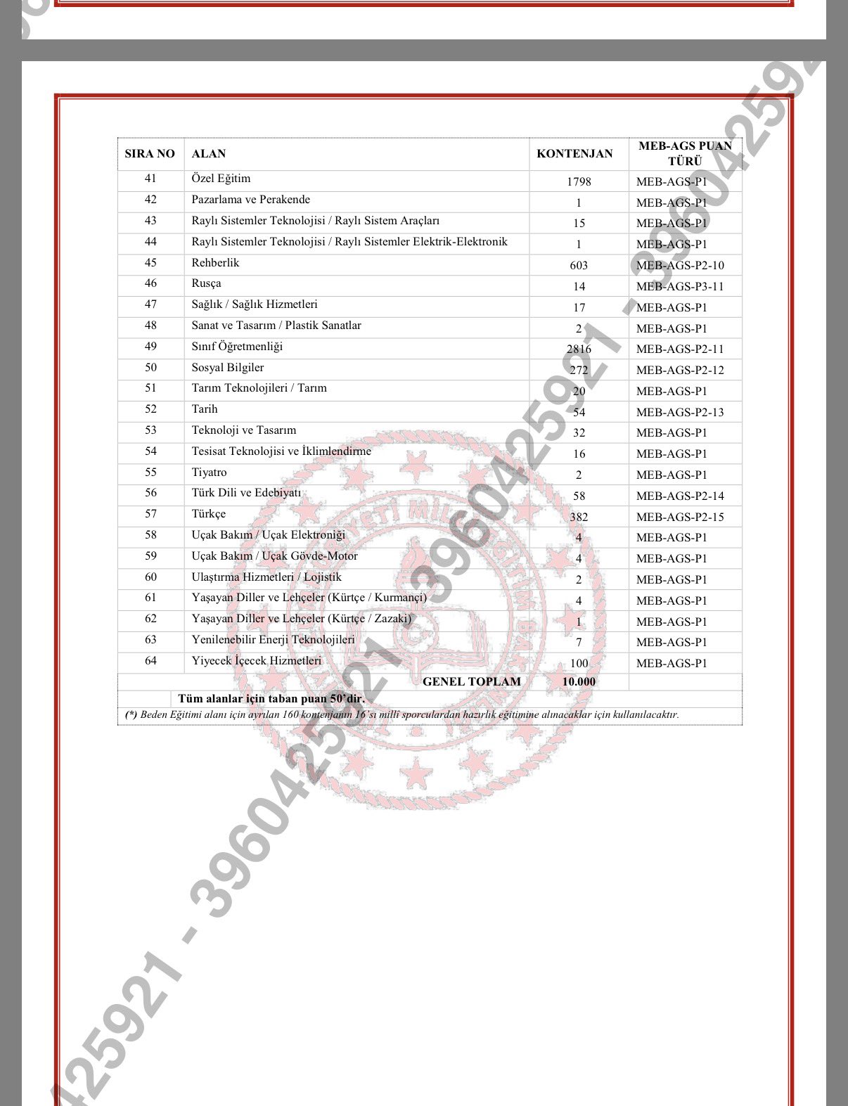 Toplam 10 bin kontenjanın yer aldığı listede en fazla kontenjan; Sınıf Öğretmenliği (2.816), Özel Eğitim (1.798), İngilizce (801), Din Kültürü ve Ahlak Bilgisi (762) ve Okul Öncesi (653) alanlarına ayrıldı. Beden Eğitimi alanındaki 160 kontenjanın 16'sı milli sporcular için kullanılacak.