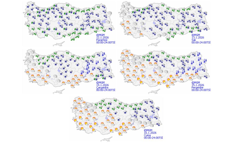 Meteoroloji Genel Müdürlüğü (MGM) verilerinden derlenen bilgilere göre, ülke genelinde hafta sonu başlayacak olan yağışlı sistem, bugünden itibaren etkisini artırarak iç ve doğu kesimlerde kar yağışına dönüşecek.
