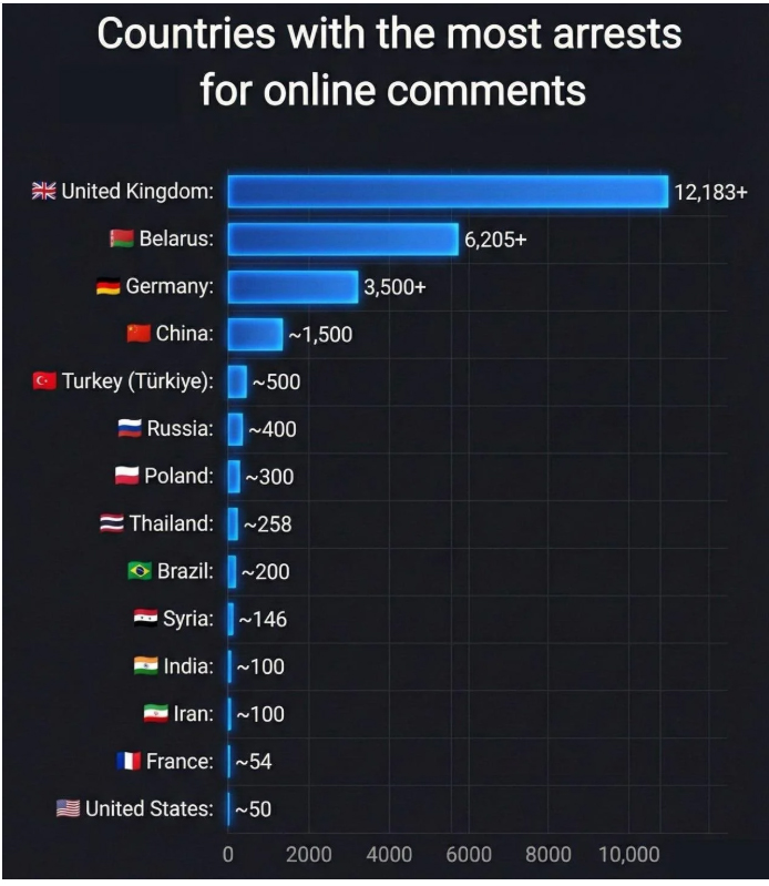 Musk, sosyal medyada paylaşılan ve İngiltere'nin dünyada sosyal medya paylaşımları nedeniyle en fazla gözaltı yapan ülke olduğunu öne süren bir grafiği alıntılayıp, "İngiltere hükümeti neden bu kadar faşist?" ifadesini kullandı. İngiltere'yi "ifade özgürlüğünü bastırmakla" suçlayan Musk, ülkeyi "hapishane adası" olarak nitelendirdi. İnternet yorumları nedeniyle en çok tutuklamanın yapıldığı ülkeler listesinde İngiltere ilk sırada. Yasakçı ülkeler listesinin ikinci sırasında Belarus, üçüncü sırasında ise Almanya yer alıyor. Listede 4'üncü sırada yer alan Çin'i ise Türkiye takip ediyor.
