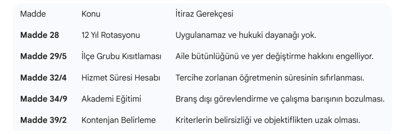 Sendika tarafından yapılan açıklamada, yönetmeliğin 28. maddesiyle getirilen "12 yıl aynı okulda görev yapan öğretmene rotasyon" uygulamasının hukuki dayanaktan yoksun olduğu vurgulandı. 2015 yılından bu yana kağıt üzerinde kalan bu düzenlemenin yeniden getirilmesinin çalışma barışını bozacağı ifade edildi.