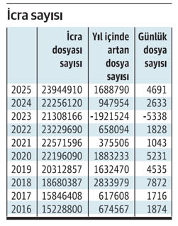 2025 yılı Kasım sonu itibarıyla karşılıksız çek tutarı 225 milyar liranın üzerine çıkarken, protestolu senet tutarı 81 milyar lirayı aştı. İcra dairelerine ulaşan icra iflas dosyası sayısı ise 2025 yılı sonu itibarıyla 24 milyonun üzerine çıktı. Bir başka ifade ile 86 milyonluk Türkiye'de her üç kişiden biri icralık oldu. 2025 yılı itibarıyla günlük icra dosyası sayısı ortalama 4 bin 691 oldu.
