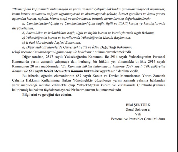 Öğretim elemanlarının 657 sayılı Kanun ve Devlet Memurlarının Yarım Zamanlı Çalışma Hakkının Kullanımına İlişkin Yönetmelikte düzenlenen yarım zamanlı çalışma hakkından yararlanabileceği mütalaa ifade edilmiş olup, yükseköğretim kurum ve kurullarında Cumhurbaşkanınca belirlenmiş bu haktan faydalanmayacak bir kadro ünvanı bulunmadığı belirtilmiştir.