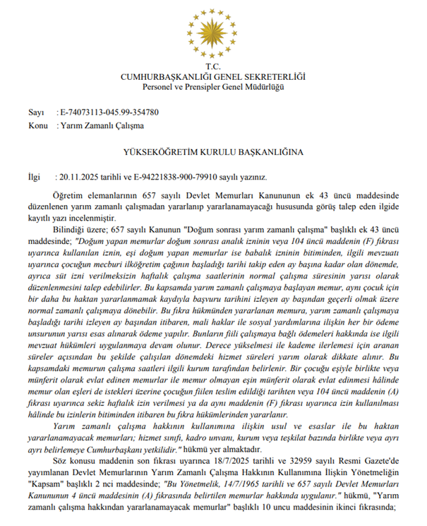 Cumhurbaşkanlığı Personel ve Prensipler Genel Müdürlüğü, 657 sayılı Devlet Memurları Kanunu'nun ek 43 üncü maddesinde yer alan yarım zamanlı çalışma hakkından yararlanıp yararlanamayacağını değerlendirdi.