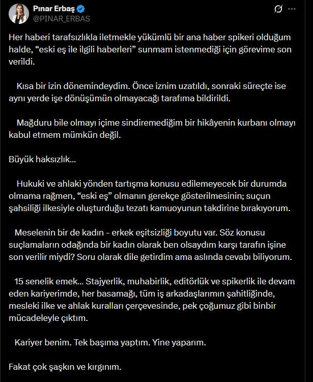 Show TV Ana Haber Sunucusu Pınar Erbaş, sosyal medya hesabı üzerinden yaptığı açıklamada; kanal yönetimi tarafından işine son verildiğini duyurdu. Erbaş, "Büyük haksızlık..." ifadelerini kullandı.
