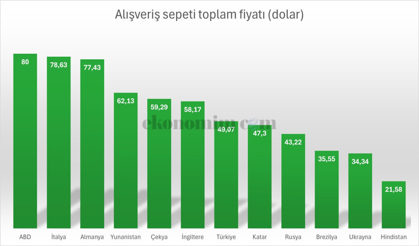 Alışveriş listesinin toplamına bakıldığında en pahalı ülke ABD oluyor. Onu İtalya, Almanya ve Yunanistan takip ediyor. Ancak pahalılıkla alım gücü ilişkisi aynı şekilde ilerlemiyor.