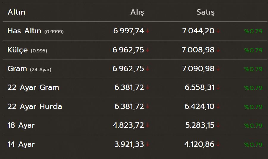 Kapalıçarşı verilerine göre, has altın (0.9999) satış fiyatı 7.044 lira, külçe altın (0.995) satış fiyatı ise 7.008 lira seviyesinde işlem gördü. Böylece has ve külçe altın da 7 bin lira bandına yaklaşarak yukarı yönlü seyrini sürdürdü.
