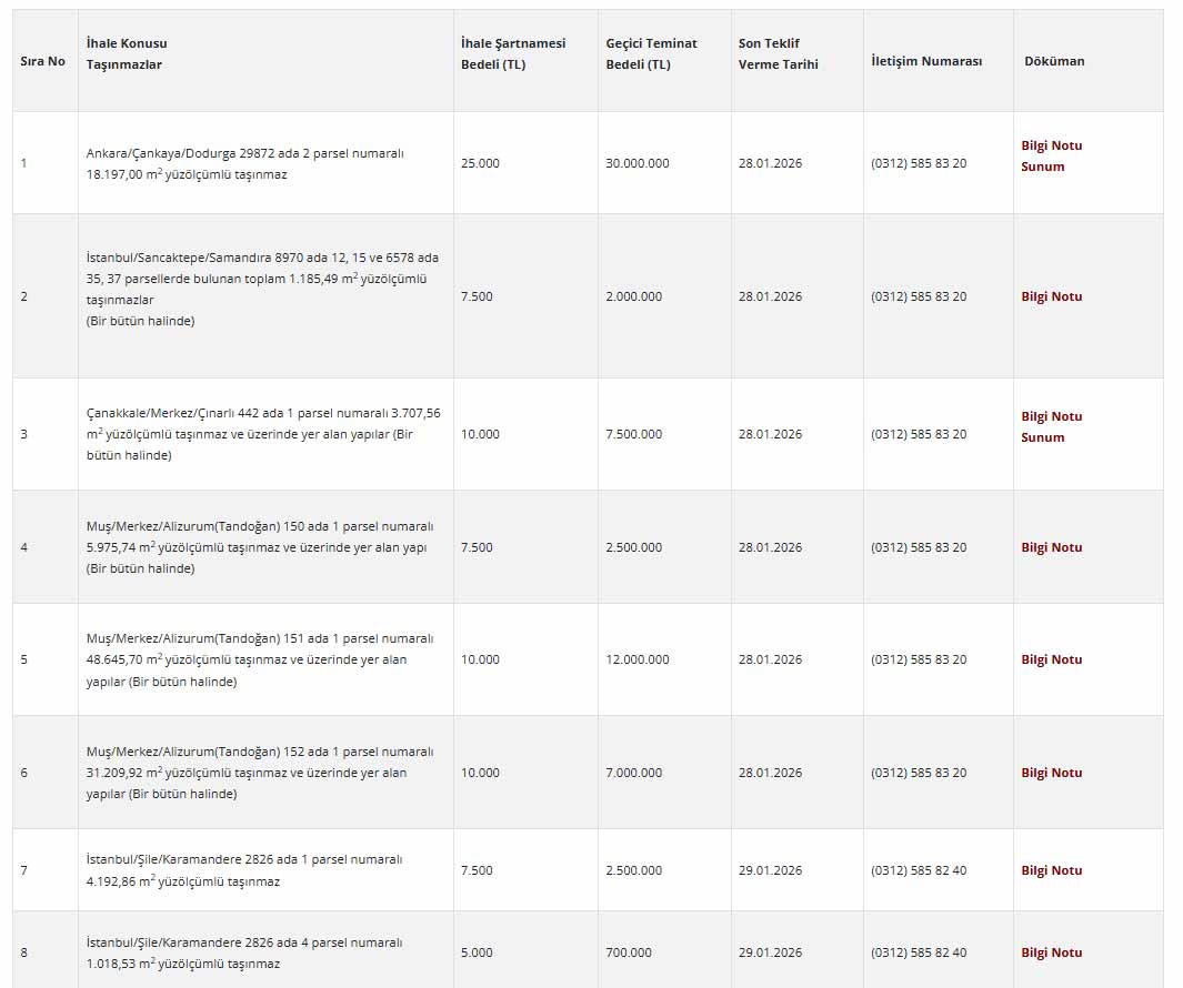 İhaleye katılmak isteyen yatırımcıların, Ankara Gölbaşı'ndaki taşınmazlar için 18 Şubat, Ankara Yenimahalle ile Adana ve Aydın'daki taşınmazlar için 19 Şubat'a kadar teklif vermesi gerekiyor.