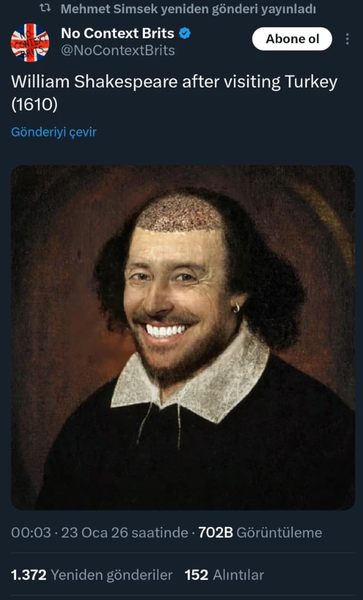 "No Context Brits" isimli hesaptan yapılan paylaşımda, ünlü yazar William Shakespeare'in görseli ile Türkiye'nin sağlık turizmine atıf yapılarak "William Shakespeare, Türkiye'yi ziyaret ettikten sonra (1610)" ifadeleriyle paylaşıldı.