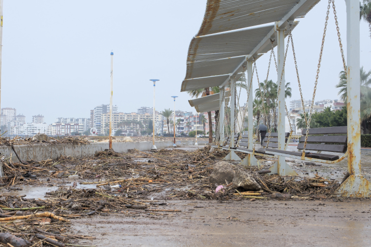 Mezitli Belediyesi ekipleri de yağışın etkisiyle sürüklenen çamur, kütük ve ağaç parçalarının biriktiği kıyı şeridini temizliyor.