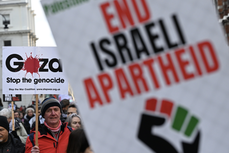İsrail'in Filistin halkına karşı işlediği soykırım devam ettiği gerekçesiyle düzenlenen ulusal yürüyüşe katılan eylemciler, İngiliz hükümetinin İsrail'e silah satışlarına devam etmesine ve Gazze'de ateşkese rağmen İsrail saldırılarının sürmesine tepki gösterdi.