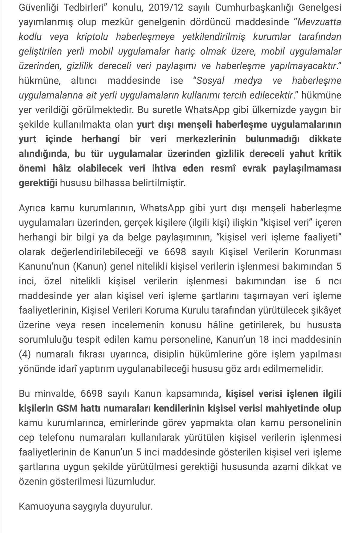 KVKK açıklamasında, 6 Temmuz 2019 tarihli ve 30823 sayılı Resmi Gazete'de yayımlanan 2019/12 sayılı Cumhurbaşkanlığı Genelgesine atıf yapıldı. Genelgede;