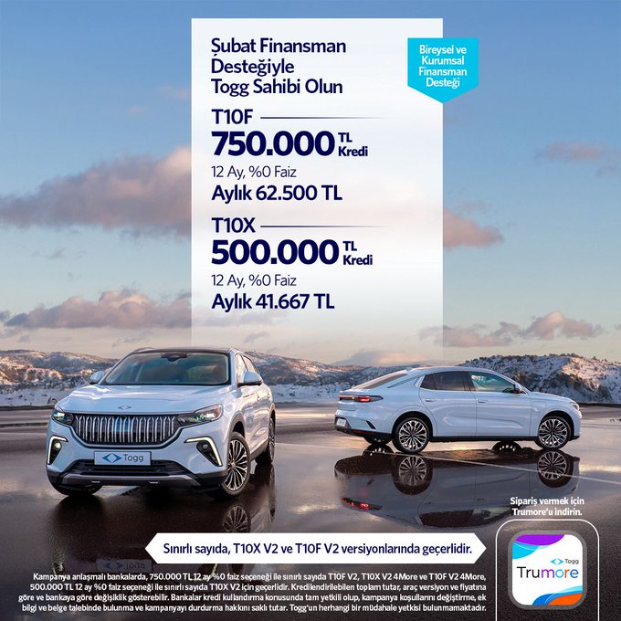 Bireysel kullanıcılar, T10X ve T10F V2 için 1 milyon 700 bin lira krediye yüzde 2,37 faizli 48 ay vade, T10X ve T10F V1 için 1 milyon 300 bin lira krediye yüzde 2,41 faizli 48 ay vade, T10X ve T10F 4More versiyonu için ise 1 milyon 500 bin lira krediye yüzde 2,32 faizli 36 ay vade seçeneklerinden yararlanabiliyor.
