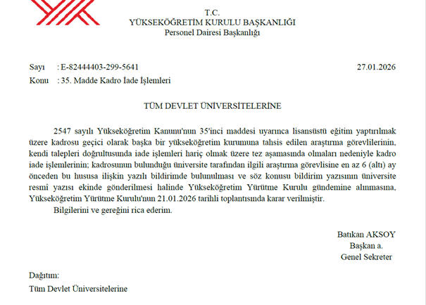 Bu hususla ilgili olarak üniversiteler tarafından alınan ani kararları sona erdirmek ve araştırma görevlilerinin planlama yapabilmesi adına, yükseköğretim kurumlarının bu durumla ilgili kararını en az altı ay önceden yazılı olarak bildirmesine ve söz konusu bildirim yazısının resmi yazı ekinde YÖK'e sunulması gerekmektedir.