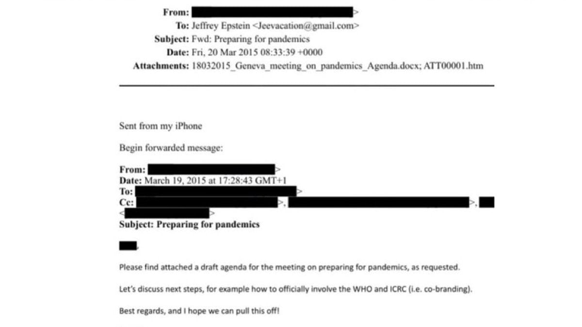 Epstein'e gönderilen mailde "Talep edildiği üzere, pandemilere hazırlık konulu toplantı için taslak bir gündemi ekte bulabilirsiniz." denilerek, Epstein tarafından bu konuyla ilgili bir talep olduğu belirtiliyorken, mailin devamında, "Örneğin DSÖ (WHO) ve ICRC'nin (yani ortak markalama/co-branding yoluyla) sürece resmi olarak nasıl dahil edileceği gibi bir sonraki adımları konuşalım. Saygılarımla, umarım bunu başarabiliriz!" cümleleriyle mail sona eriyor.