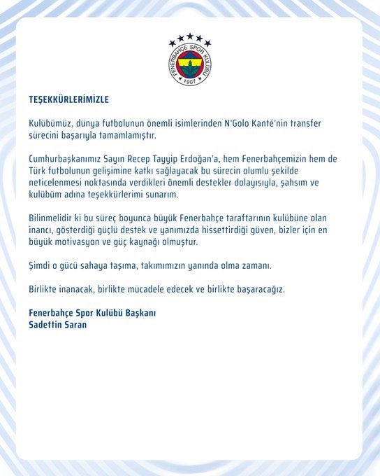 "Kulübümüz, dünya futbolunun önemli isimlerinden N'Golo Kante'nin transfer sürecini başarıyla tamamlamıştır. Cumhurbaşkanımız Sayın Recep Tayyip Erdoğan'a, hem Fenerbahçe'mizin hem de Türk futbolunun gelişimine katkı sağlayacak bu sürecin olumlu şekilde neticelenmesi noktasında verdikleri önemli destekler dolayısıyla şahsım ve kulübüm adına teşekkürlerimi sunarım. Bilinmelidir ki bu süreç boyunca büyük Fenerbahçe taraftarının kulübüne olan inancı, gösterdiği güçlü destek ve yanımızda hissettirdiği güven, bizler için en büyük motivasyon ve güç kaynağı olmuştur. Şimdi o gücü sahaya taşıma, takımımızın yanında olma zamanı. Birlikte inanacak, birlikte mücadele edecek ve birlikte başaracağız."