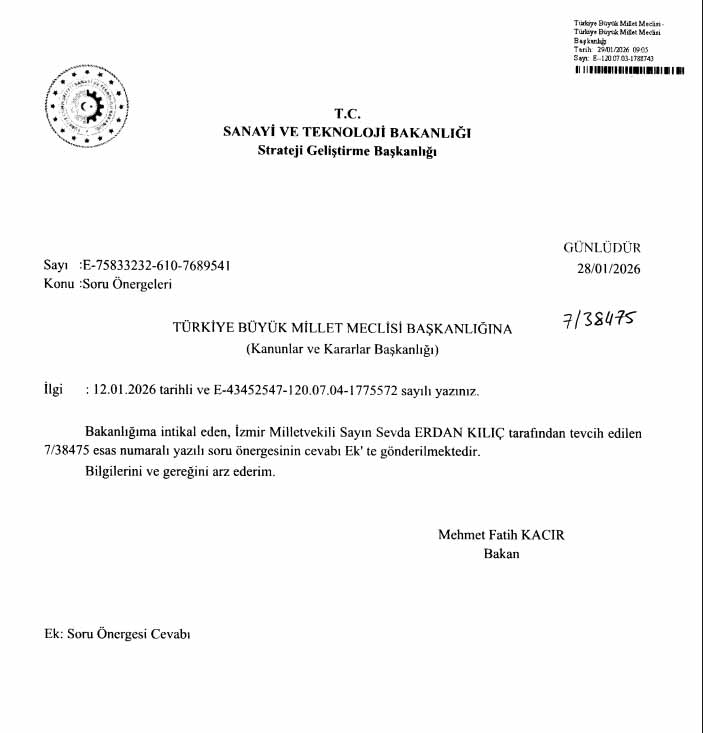 İzmir Milletvekili Sevda Erdan Kılıç'ın soru önergesini 28.01.2026 tarihinde cevaplayan Sanayi ve Teknoloji Bakanı Mehmet Fatih Kacır şunları söyledi: