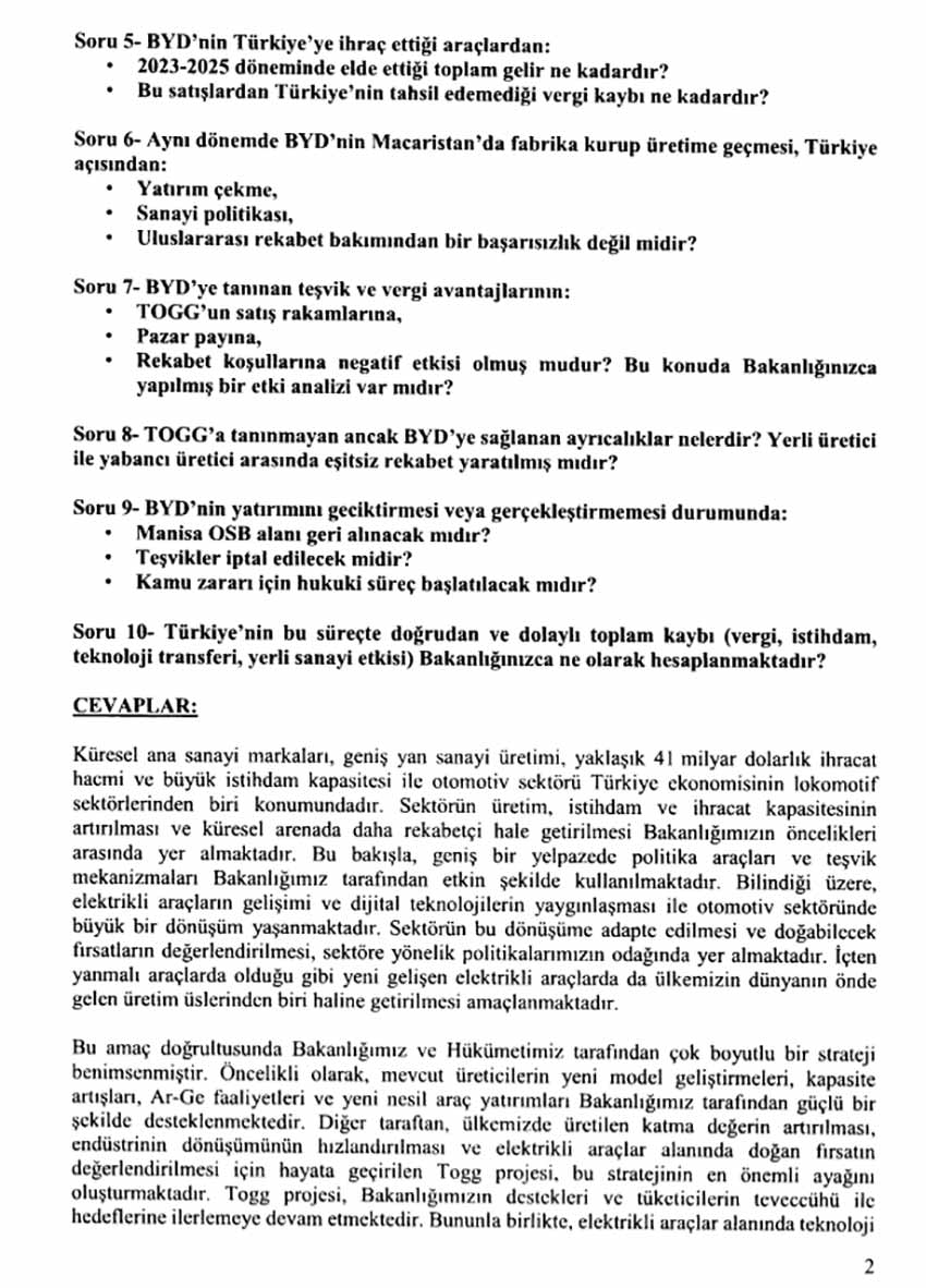 BYD aldığı yatırım teşviğiyle 2024 ve 2025 yıllarında 40 bin otomobil sattı. Bu süreçte 3 milyar dolarlık satış hacimine ulaşan firma hakkında imzalanan söyleme doğrultusunda cezai müeyyide uygulanması gündemde...