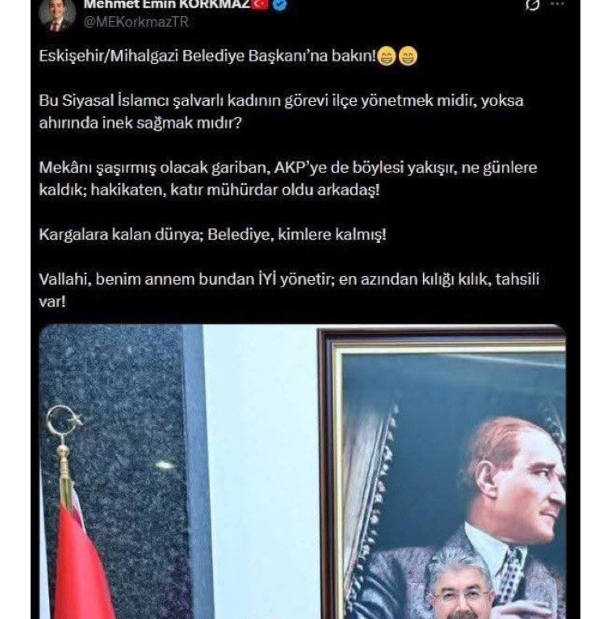 Mehmet Emin Korkmaz'ın dün akşam saatlerinde yaptığı paylaşımda, "Eskişehir/Mihalgazi Belediye Başkanı'na bakın! Bu siyasal İslamcı şalvarlı kadının görevi ilçe yönetmek midir, yoksa ahırında inek sağmak mıdır? Mekanı şaşırmış olacak gariban, AKP'ye de böylesi yakışır. Ne günlere kaldık? Hakikaten katır mühürdar oldu arkadaş! Kargalara kalan dünya, belediye kimlere kalmış? Vallahi benim annem bundan İYİ yönetir. En azından kılığı kılık, tahsili var" ifadeleri yer aldı. Paylaşımın aşağılayıcı üslubu kamuoyunda geniş yankı uyandırdı. Korkmaz, gelen tepkilerin ardından sosyal medya hesaplarını kapattı.